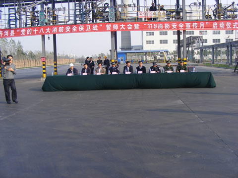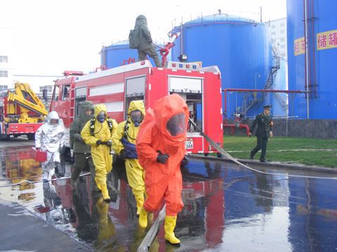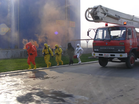 霎那間,一群“天兵”從四面八方奔來。專業(yè)人員現(xiàn)場查看險情后,將泄漏情況向指揮人員做緊急匯報,并啟動公司危險化學(xué)品應(yīng)急滅火救援預(yù)案,聞訊趕來的消防官兵迅速檢查堵漏,并通過移動遙控水炮遠(yuǎn)距離滅火。在消防隊(duì)的掩護(hù)下,一隊(duì)穿著隔離衣的醫(yī)生抬著擔(dān)架將“暈倒”的員工救離現(xiàn)場,并迅速拿出醫(yī)療器械現(xiàn)場施救。不遠(yuǎn)處,拉起了一條紅色的隔離帶,警戒人員指揮著來往車輛,并緊急疏散往返群眾,檢測人員對流淌的液體進(jìn)行監(jiān)測,并進(jìn)行處理……。驚心動魄的30分鐘后,事故處理完畢,生產(chǎn)恢復(fù)正常。