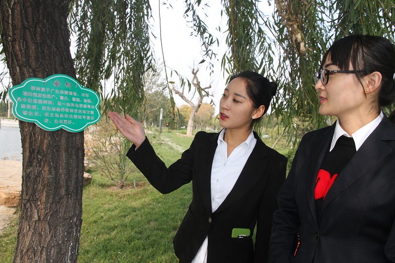 正式的“身份證”。制作的形式多樣、顏色各異的銘牌,內容涉及苗木名稱、特點、生產習性等,引員工駐足。(圖為員工查看新制作的樹木“銘牌”)。